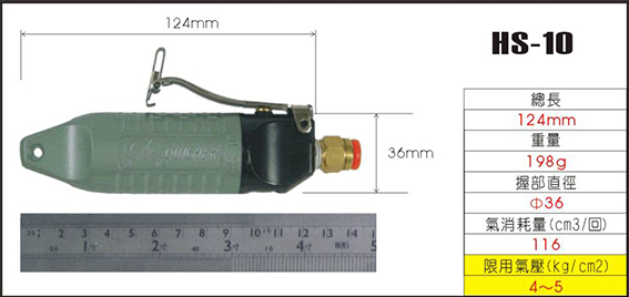 厂家直销台湾原装快取牌HS-10气动风剪刀,按扳控制式气动剪刀,气缸标准型号产品,可广泛使用。适用于切断、压接、冲孔、铆接、弯曲等可在各种作业上大大省力,快捷完成。全长 | 重量 | 握部直径 | 气体消耗 | 加压力 | 操作气压 |