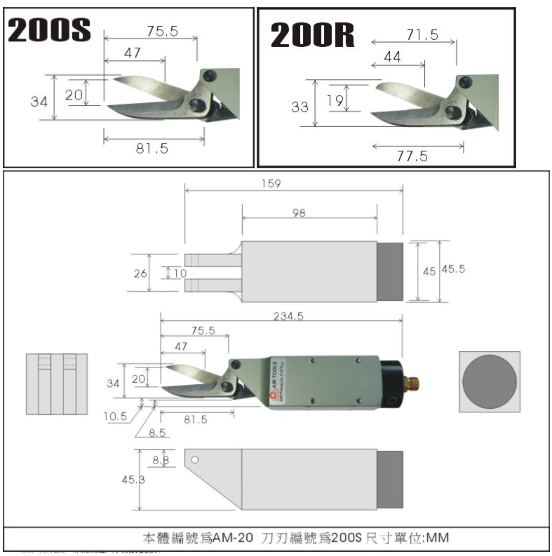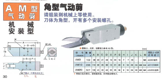 AM-20气动空气剪刀(单发式)/ 气动铁板剪(单发式)适合于切断绞线、细线、铁板、箍铁、树脂板等。有标准型与加强型两种。刀刃专利设计,除了较传统工具更省力外,对于传统工具无法剪裁之材料,如不绣钢线、钢琴线等,皆可让您轻轻松松完成工作。刀刃更换简易,现场即可操作,减少维修等待时间,进而提高工作效率。